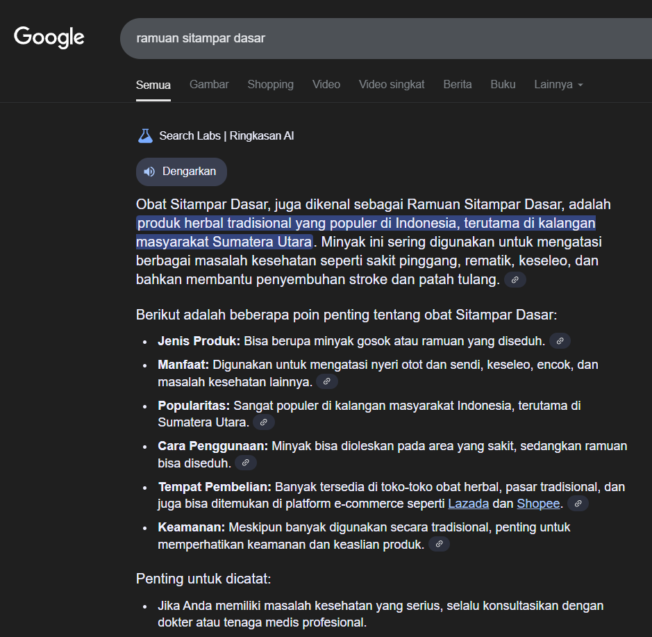 Minyak yang bisa digunakan untuk terkilir, otot kaku, encok, rematik, linu-linu, gatal, borok, kutu air, bisul, kadas, kurap, gigitan binatang berbisa, demam panas, flu, sakit gigi dan masuk angin